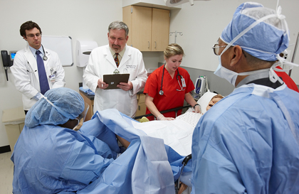 Through a two-way mirror, faculty and staff monitor student performance and can alter the patient’s symptoms and behavior to make situations simulate real life, such as an allergic reaction or giving birth, as shown in this photo.
