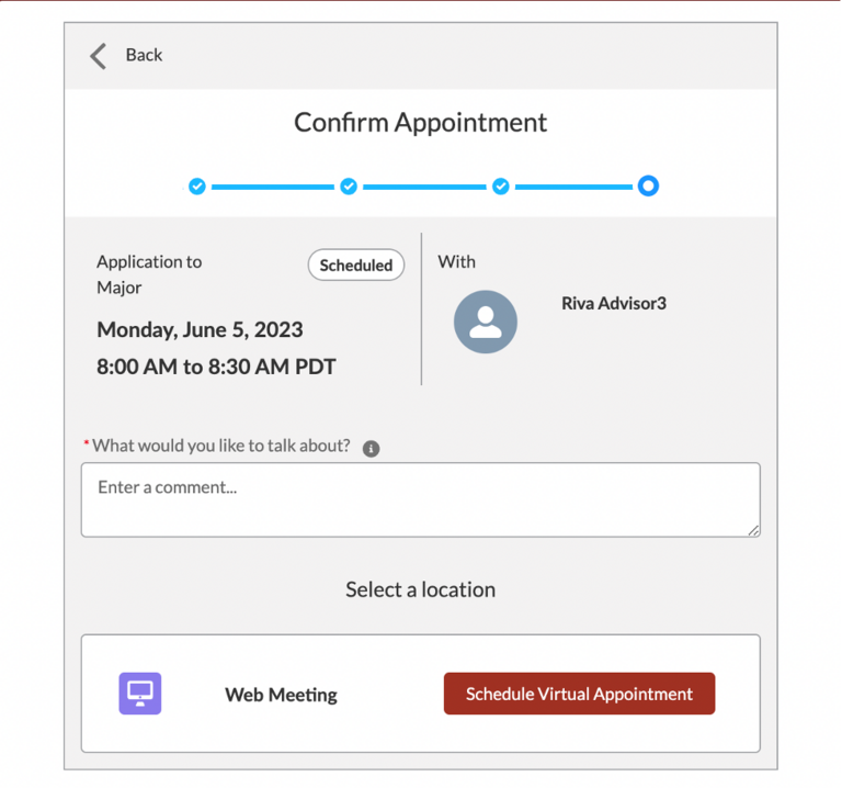 5. Once you click on the time block, you will be taken to the next window where you must enter some details about your appointment and select the location (the way in which you would like to meet with your advisor: in person, phone, or virtual).