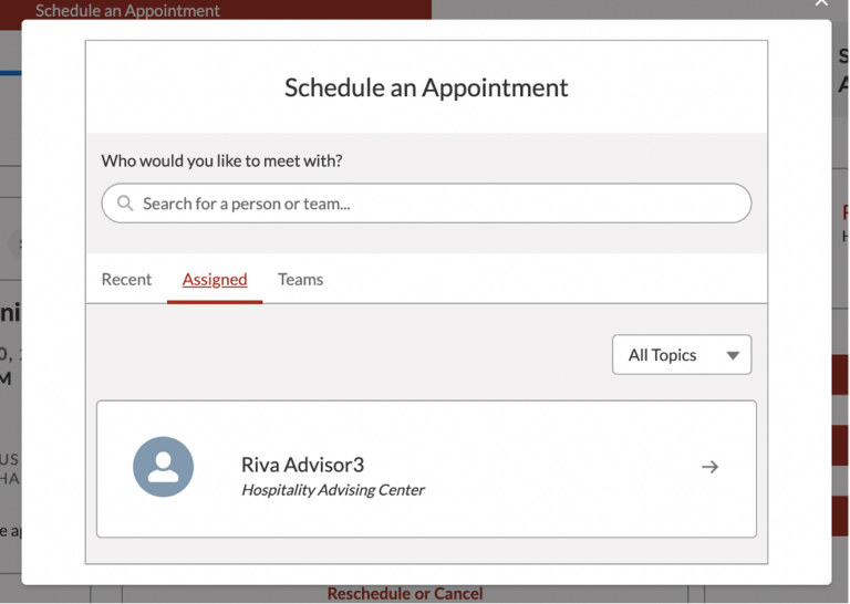 - If you have had or scheduled appointments in the past, you will see a list of advisor(s) you have met with recently. If you don't see anyone listed or you want to see all advisors you can meet with, make sure you are on the Assigned tab.