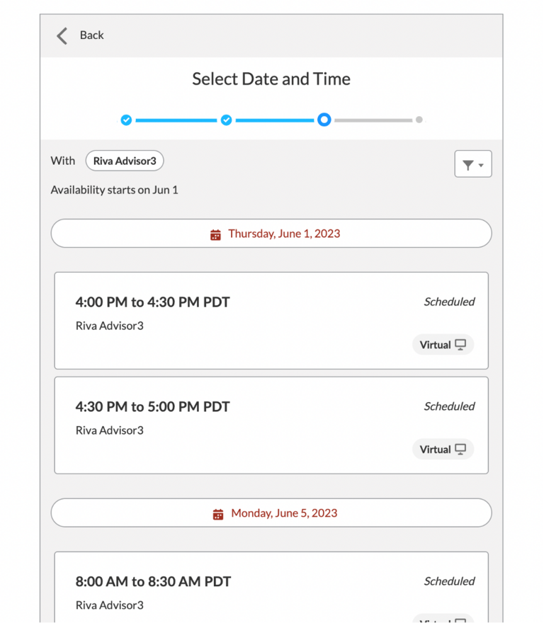 - You can filter - by clicking the filter icon in the upper right- by location (the way in which you will meet your advisor: in person, phone, virtual).