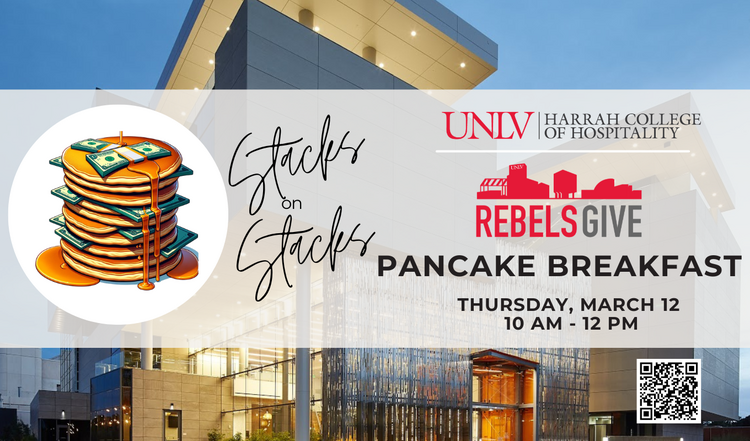 You're invited to the third annual Stacks on Stacks Pancake Breakfast, hosted by the UNLV Harrah College of Hospitality in celebration of Rebels Give, UNLV’s annual day of giving. Those who give $10 or more to the College of Hospitality Fund for Excellence are invited to enjoy a pancake breakfast in Hospitality Hall, prepared and served by College of Hospitality faculty, staff, and alumni.