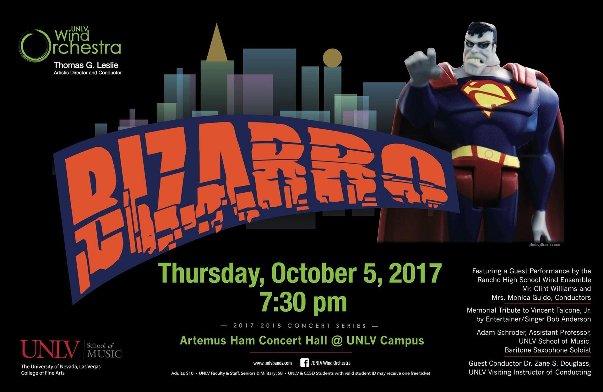 The UNLV Wind Orchestra is pleased to present its first concert of the season, "Bizarro," at 7:30 p.m. on Thursday, Oct. 5, in Artemus Ham Concert Hall. The concert features entertainer extraordinaire Bob Anderson in a tribute to Vincent Falcone; UNLV Jazz professor Adam Schoreder, bari sax soloist; and the Rancho High School Wind Ensemble, under the direction of Clint Williams and Monica Guido in a special guest appearance.