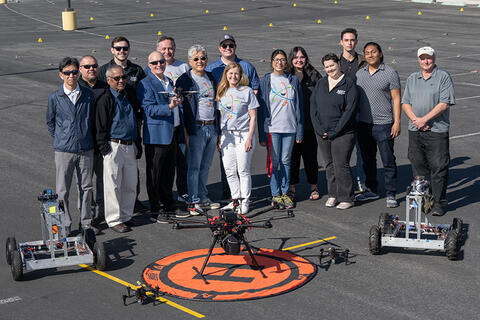 NSSTC students, faculty and staff from UNLV, University of New Mexico and Mission Support and Test Services gather for a group photo during the Spring 2024 drone demonstration and experiments at UNLV.