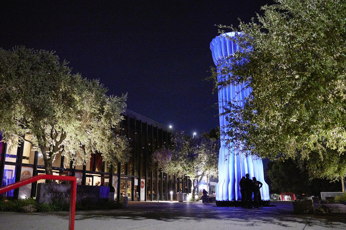 Perhaps one of the most iconic pieces of public art in the Las Vegas valley, The Flashlight was installed in between the Artemus W. Ham Concert Hall and the Judy Bayley Theatre in 1981. It was designed by prolific, well-known public artists Claes Oldenburg and Coosje Van Bruggen. The Flashlight is 38 feet, 6 inches high and 10 feet, 6 inches in diameter. Oldenburg was inspired by ushers' use of flashlights to guide patrons to their seats, and The Flashlight is pointed down, but not because of concerns about the flight paths from what is now Harry Reid International Airport. Instead, the artists thought a light shining into the sky was "clichéd and reminiscent of authoritarian spectacle." The switch on the side of The Flashlight was inspired by the mountains around the Las Vegas Valley.